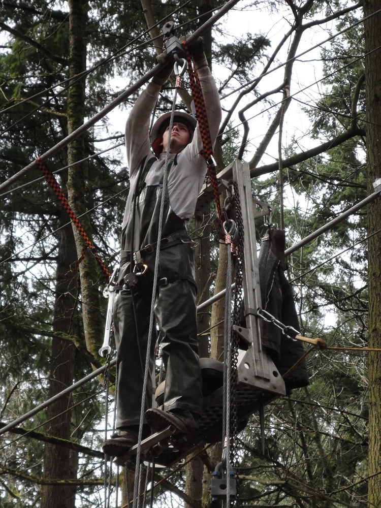 - Austin Thompson, working from the bosun’s chair hung from a skyline, installs mainline cable clips.