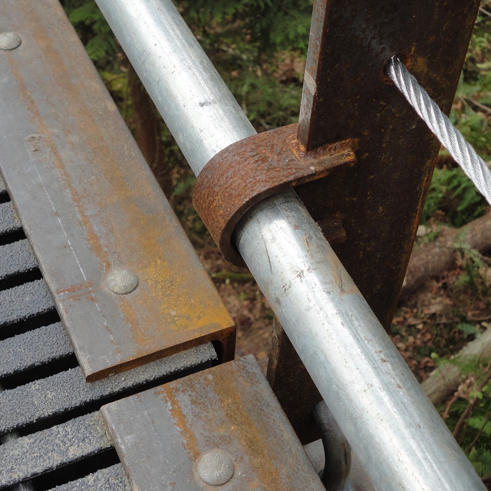 - Typical fixed/pinned stringer connection, featuring suspender bars with integral rails and 1/2″ gapped fiberglass decking pinned in place with angle.