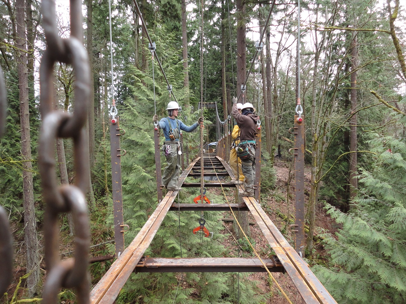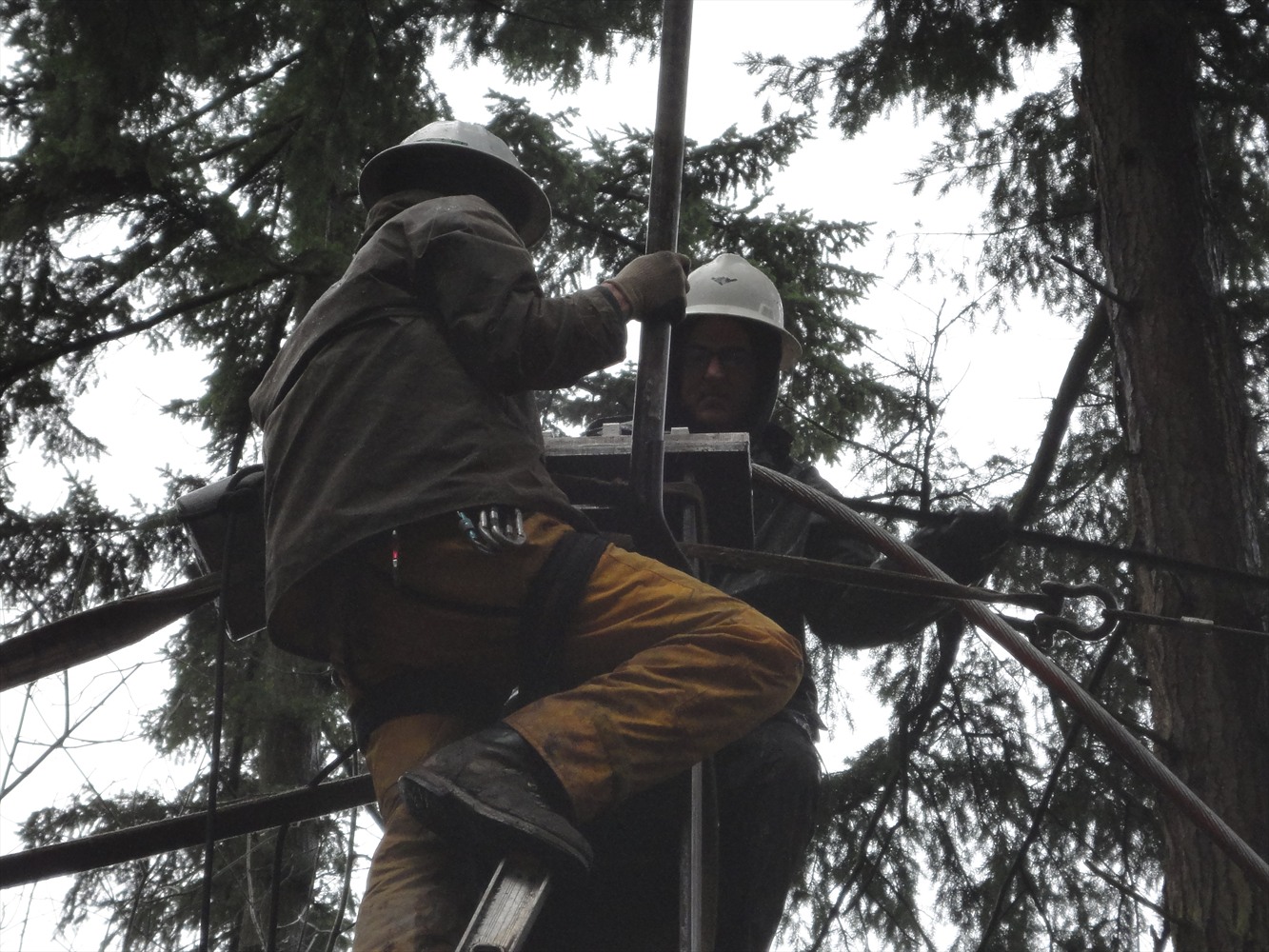 - Marty Walz and Steve Howell wrestle 1-1/4″ mainline cables into their towertop saddles.