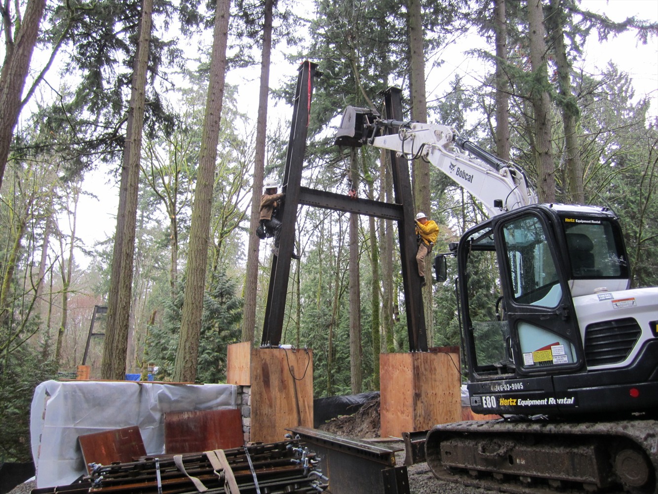 - Bridge towers were raised onto prepared abutments using a small rubber-tracked excavator.